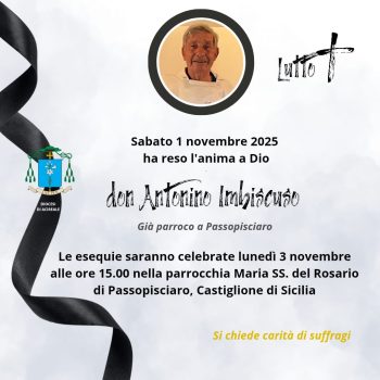 È tornato alla Casa del Padre sabato 1° novembre don Antonino Imbiscuso, sacerdote molto amato e stimato nella Diocesi di Acireale. I funerali saranno celebrati lunedì 3 novembre alle ore 15 nella chiesa parrocchiale “Maria SS. del Rosario” di Passopisciaro, la comunità che per tanti anni ha guidato con dedizione e spirito di servizio.