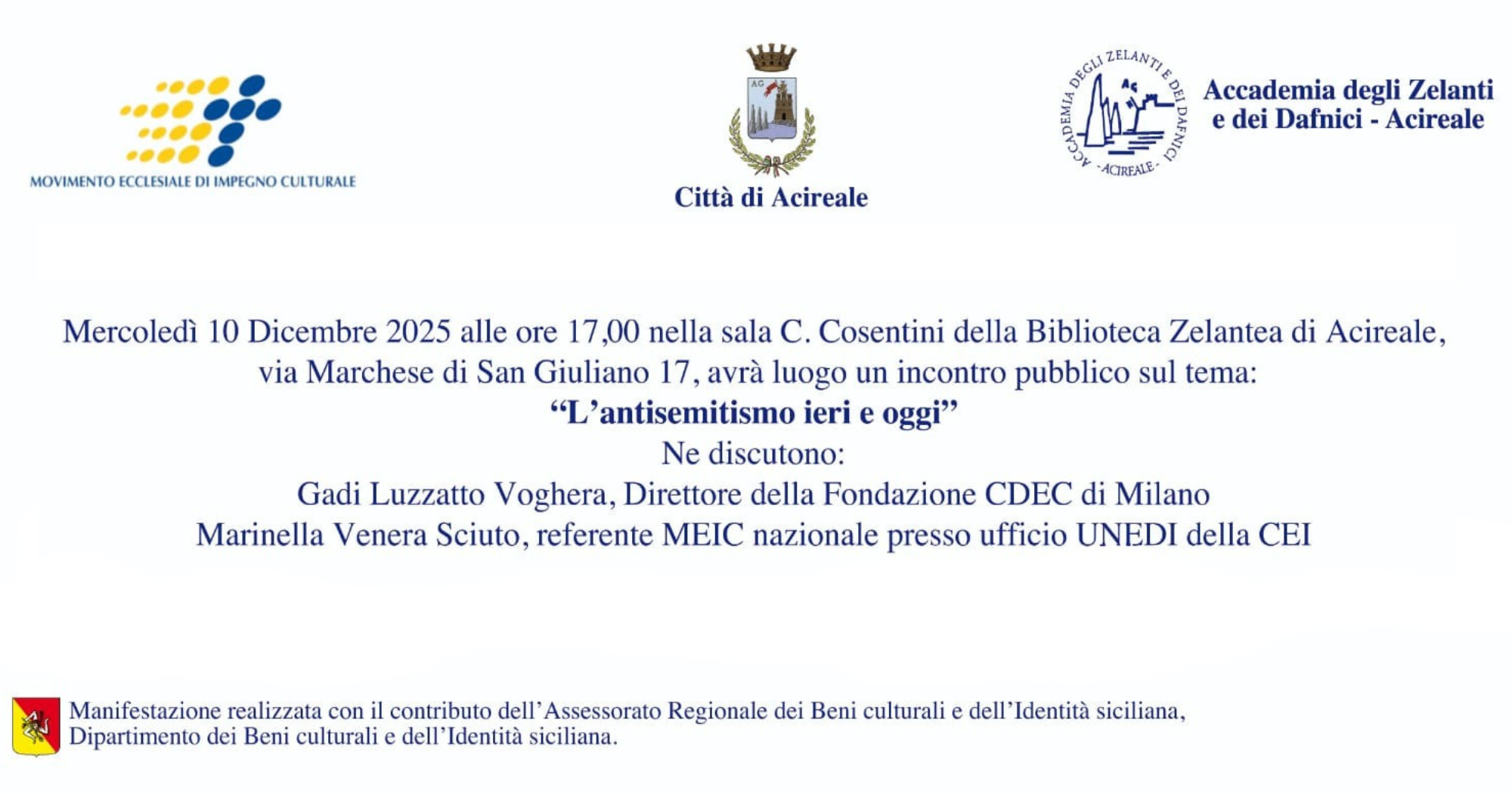 Ad Acireale mercoledì 10 dicembre alle 17, nella Sala Cristoforo Cosentini della Biblioteca Zelantea, Gadi Luzzatto Voghera, direttore della fondazione CDEC di Milano, e Marinella Sciuto, referente MEIC nazionale all’ufficio UNEDI della CEI, daranno vita ad un interessante dibattito per riflettere sui temi dell’antisemitismo e del dialogo interreligioso.