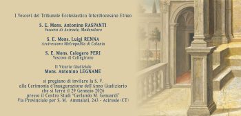ACIREALE Giovedì 29 gennaio 2026, a partire dalle ore 16.30, nei locali del Centro Studi “Gerlando M. Genuardi” di Acireale (Via Provinciale per S. M. Ammalati, 243), si terrà la solenne cerimonia di inaugurazione dell’Anno Giudiziario 2026 del Tribunale Ecclesiastico Interdiocesano Etneo (TEIE), organismo che opera a servizio delle Diocesi di Acireale e Caltagirone e dell’Arcidiocesi di Catania.