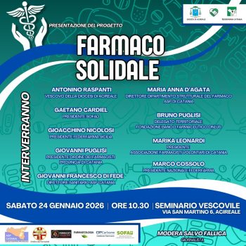 Il Progetto Farmaco Solidale, promosso da Sofad in collaborazione con la Diocesi di Acireale, cui ha dato il patrocinio Federfarma Nazionale, coinvolge Federfarma Catania, l’Ordine dei Farmacisti e l’ASP di Catania, l’Associazione Farmacisti Volontari, CIPCarbone, Farma.Ecologia e intende realizzare un’azione per sensibilizzare i cittadini a donare farmaci e prodotti farmaceutici integri, non utilizzati e in corso di validità, organizzarne la raccolta presso le farmacie e il conferimento in Punti di Dispensazione messi a disposizione dalla Diocesi, nei quali verrà assicurata la distribuzione gratuita alle persone in stato di fragilità economica e povertà sanitaria, ad opera dei farmacisti volontari.