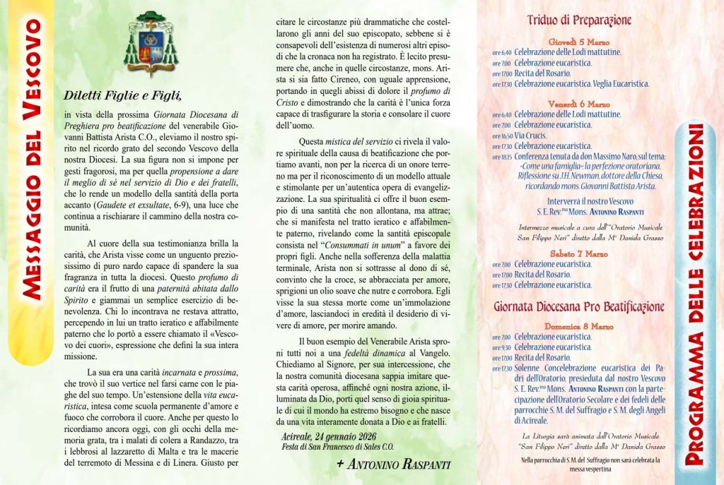 La diocesi di Acireale si prepara a vivere da giovedì 5 a domenica 8 marzo 2026, giorni di profonda spiritualità e comunione ecclesiale in occasione della Giornata Diocesana di Preghiera per la beatificazione del Venerabile Giovanni Battista Arista, secondo vescovo della diocesi (1907-1920) e figura ancora oggi amata dal popolo acese.