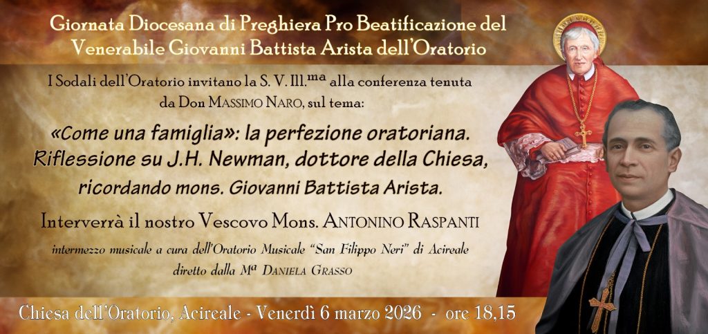L’incontro metterà in dialogo la spiritualità oratoriana con la figura del beato John Henry Newman, offrendo una chiave di lettura attuale del carisma vissuto da Arista. Interverrà anche il vescovo di Acireale, mons. Antonino Raspanti. La serata sarà arricchita da un intermezzo musicale a cura dell’Oratorio Musicale “San Filippo Neri”.