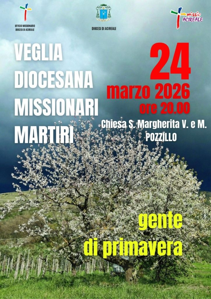 L’ufficio Missionario diocesano insieme ai Missio Giovani, guidati da don Orazio Sciacca, invitano alla celebrazione comunitaria della veglia “Gente di primavera”, che si terrà martedì 24 marzo alle ore 20.00 nella chiesa Santa Margherita V. e M. di Pozzillo.