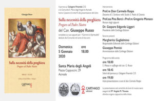 "Sulla necessità della preghiera, Pregare col Padre Nostro" Scarica la locandina A due anni dalla pia dipartita del Can. Giuseppe Russo nella Comunità di S. Maria degli Angeli in Acireale, domenica 5 gennaio 2020, dopo la Santa Messa delle ore 18.00, si terrà la presentazione del testo "Sulla necessità della preghiera, Pregare col…