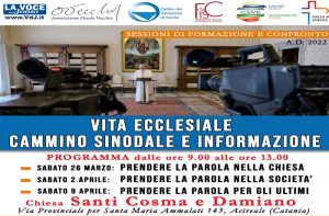 Evento formativo per i giornalisti Clicca qui e scarica la locandina La Voce dell’Jonio di Acireale, la Diocesi acese, con l’Ufficio per le Comunicazioni sociali e l’Equipe per il Cammino sinodale, e la Delegazione siciliana della Fisc (l’associazione che raccoglie i giornali diocesani) e…