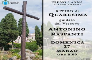 EREMO DI SANT'ANNA - DOMENICA 27 MARZO - ore 9.00 Mons Antonino Raspanti, Vescovo di Acireale, detterà il ritiro di quaresima Domenica 27 Marzo 2022 nella Chiesa Eremo di Sant’Anna in Aci San Filippo. La preghiera delle lodi alle ore 9.00 darà inizio alla giornata che si concluderà alle ore 18.00 con la celebrazione della Santa…