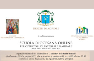 Clicca qui e scarica la Locandina L’ufficio diocesano per la pastorale della famiglia e l’istituto diocesano di Teologia “Sant’Agostino” promuovono una scuola diocesana on line di pastorale familiare per l’anno 2020-2021. Il percorso formativo si struttura in 7 incontri a cadenza mensile (da dicembre…