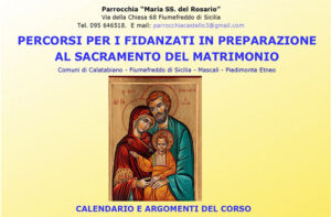 Da Lunedì 12 ottobre a lunedì 23 novembre 2020 Clicca qui e scarica il programma L’itinerario, proposto dalla parrocchia Maria SS. del Rosario in Fiumefreddo di Sicilia – Castello per i fidanzati appartenenti ai comuni di Calatabiano, Fiumefreddo di Sicilia, Mascali e Piedimonte Etneo, intende prepare a ricevere il sacramento del matrimonio per favorire…