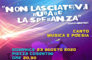 Cosentini, domenica 23 agosto, ore 20.30 Clicca qui e scarica la locandina "Non lasciatevi rubare la speranza", tratto dal messaggio di papa Francesco, è il tema della serata musicale che domenica 23 agosto si svolgera' alle ore 20,30, nella piazza di Cosentini (fraz. di…