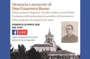 DOMENICA 26 APRILE 2020 ORE 19 Live al link: https://www.facebook.com/arcipreturaparrocchialemariassmaimmacolatadagala/ Scarica la Locandina La comunità parrocchiale Maria SS.ma Immacolata di Dagala del Re, in occasione del 90esimo dalla morte, ricorderà la figura di Don Francesco Russo, primo arciprete parroco e cavaliere della Corona d’Italia. Lo farà con un…