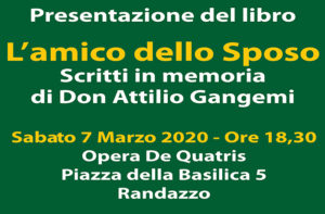 Sabato 7 marzo 2020, alle ore 18.30,presso l'Opera De Quatris in Piazza della Basilica 5 in Randazzo, si terrà la presentazione del libro "L'Amico dello Sposo, scritti in memoria di don Attilio Gangemi". Il sac. prof don Attilio si è addormentato nella Pace di Cristo lo scorso 21 ottobre Interverranno:…