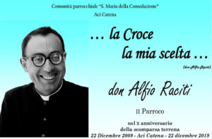 Scarica la locandina Domenica 22 dicembre 2019 ricorre il x anniversario della scomparsa terrena di don Alfio Raciti, secondo parroco della parrocchia “Santa Maria della Consolazione”. Parroco instancabile e innamorato di Dio, nasce ad Aci Catena il 5 gennaio 1930 e dopo aver compiuti gli studi presso il seminario…