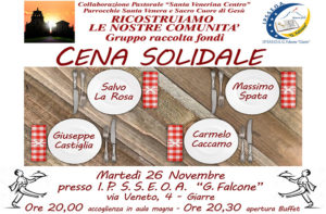 Scarica la Locandina Anche una cena solidale, che si terrà martedì 26 novembre 2019 nell'Istituto Alberghiero "Giovanni Falcone" di Giarre, con personaggi di primo piano dello spettacolo in Sicilia, tra gli eventi che il comitato “Ricostruiamo le nostre comunità” di Santa Venerina ha programmato per le prossime settimane. Iniziative…