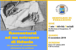 Scarica la Locandina Scarica la scheda di iscrizione ed il programma L’E.A.S. - Ente Attività Sociali di Acireale organizza un seminario di formazione venerdì 8 novembre 2019, dalle ore 8,30 alle 14.00, in via Marchese di Sangiuliano 79, Acireale, sul tema “Raccontarsi ad un estraneo di fiducia –…