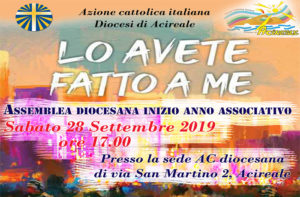Scarica la locandina L'Azione Cattolica diocesana comunica che Sabato 28 settembre 2019 avrà luogo alle ore 17.00 nella sede di via San Martino 2 Acireale l'assemblea diocesana di inizio anno associativo dal tema "Lo avete fatto a me" "Ci aspetta un anno pieno di impegni importanti…