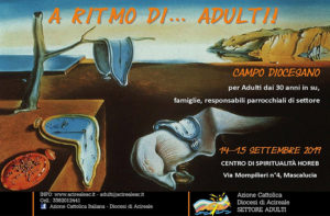 Scarica la Locandina Si svolgerà il 14 e 15 Settembre 2019 nel Centro di spiritualità HOREB di Mascalucia il Campo diocesano per il Settore Adulti di Azione Cattolica dal titolo “A RITMO DI… ADULTI!” che . Gli argomenti trattati introdurranno al tema del prossimo anno associativo 2019/2020: “CHE TEMPO!”.