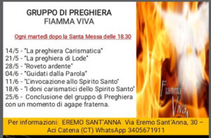Scarica la Locandina Il Gruppo di Preghiera Fiamma Viva informa che si svolgerà un momento di preghiera ogni martedì (ultimo incontro martedì 26 giugno 2019) dopo la Santa Messa delle ore 18,30 nella chiesa dell’ Eremo di Sant’Anna in Aci Catena. …