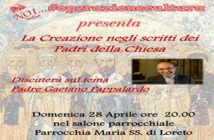 Scarica la locandina Ultimo incontro #operazionecultura nella Parrocchia Santuario Maria SS. di Loreto in Acireale. Domenica 28 Aprile 2019 alle ore 20.00 nel salone parrocchiale della suddetta parrocchia si terrà l'incontro dal titolo “La Creazione negli scritti dei Padri della Chiesa". Discuterà sul tema don Gaetano Pappalardo, direttore spirituale del seminario vescovile di Acireale.