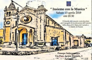 Scarica la Locandina Sabato 13 aprile 2019, alle ore 20.30, avrà luogo nel Presepe Settecentesco di Acireale un concerto di beneficenza "Insieme con la Musica" a favore del progetto di ricostruzione dell'importante luogo di aggregazione dell’oratorio della Chiesa Santa Maria del Carmelo di Pennisi, colpito dal recente sisma del 26 dicembre 2018…