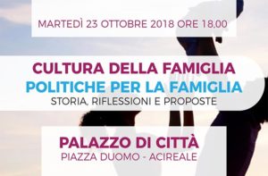 Martedì 23 ottobre 2018 alle ore 18.00 nel Palazzo di Città, sito in Piazza Duomo in Acireale, avrà luogo un incontro sul tema: "Cultura della Famiglia, Politiche per la Famiglia - Storia, riflessioni e proposte" Introduce: Prof. Ferdinando Raffaele (Alleanza Cattolica) Interverranno: Mons. Giovanni Mammino, vicario generale della diocesi. Dott.