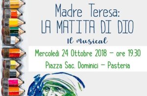 Mercoledì 24 ottobre 2018, alle ore 19,30, organizzato dalla parrocchia San Giuseppe di Pasteria e dal Comune di Calatabiano, nella piazza Sac. Dominaci (Pasteria), sarà rappresentato il musical “Madre Teresa: la matita di Dio”, realizzato dai giovani della parrocchia Maria SS Immacolata di Fiumefreddo di Sicilia. Scarica la…
