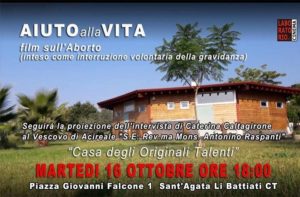 Martedì 16 ottobre 2018, alle ore 18, nella Casa degli originali talenti, in piazza G. Falcone n. 1 a Sant’Agata Li Battiati, organizzato da Laboratorio cinema, sarà proiettato il film “Aiuto alla vita” (sul tema dell’aborto inteso come interruzione volontaria della gravidanza). A seguire, sarà proiettata l’intervista di Caterina Caltagirone…