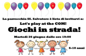 Un’iniziativa nuova, animata dalla speranza di una risposta che, ci auguriamo non tarderà ad arrivare. “Let’s play at the COM! Giochi in strada!” è la manifestazione che martedì 26 giugno 2018, alle ore 19, rivolta ai bambini dai 6 ai 10 anni, vedrà impegnati i giovani della parrocchia SS. Salvatore,…
