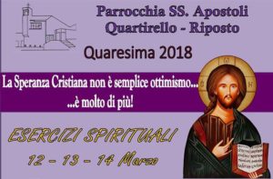 La comunità parrocchiale SS. Apostoli Quartirello in Riposto organizza nei giorni 12-13-14 marzo 2018 alle ore 19.00 gli esercizi spirituali in vista della santa Pasqua. Lunedì 12 Marzo Padre Carmelo Umana (salesiano) rifletterà su "La Speranza luogo Formativo" Martedì 13 Marzo don Antonio Pennisi (diocesano) rifletterà su "La Speranza nella…