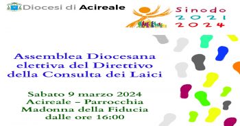 Articolo di Chiara Costanzo Sabato 9 marzo dalle ore 16:00 alle ore 19:00 nei locali della Parrocchia Madonna della Fiducia è indetta l'assemblea per il rinnovo del Direttivo della consulta delle associazioni laicali (CDAL). Presente Mons. Agostino Russo, vicario generale della Diocesi di Acireale, che accompagnerà quest'incontro a partire dalla…