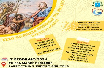 Chiesa Madre di Giarre, Mercoledì 7 febbraio – dalle ore 16.30 VERA PRESTI, RESPONSABILE DIOCESANA DELLA PASTORALE DELLA SALUTE: ” LA VITA ANCHE SE SEGNATA DAL DOLORE HA UNA SUA DIGNITA'” Articolo di Chiara Costanzo, UCS L’11 febbraio ricorre la Giornata mondiale del Malato istituita da Papa Giovanni Paolo II nel 1992, nella memoria…