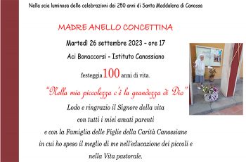 Martedì 26 settembre 2023 - La comunità religiosa delle Canossiane di Aci Bonacorsi è in festa per il centenario di Madre Concettina Anello: "Voglio lodare e ringraziare il Signore per il dono della vita: cento anni di Lode al Signore" Nell'anno celebrativo dei 250 anni della nascita di Santa…