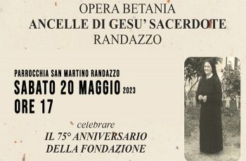 SABATO 20 MAGGIO, ORE 17, SANTA MESSA (chiesa San Martino) PRESIEDUTA DAL VESCOVO RASPANTI: "LE ANCELLE, UMILI STRUMENTI UMANI, RENDONO GRANDE IL MINISTERO SACERDOTALE" L'Istituto “Opera Betania Ancelle di Gesù Sacerdote" quest'anno ricorda il 75° anniversario di fondazione. E' stato fondato a Randazzo da Suor Maria Addolorata, al secolo Giuseppina…