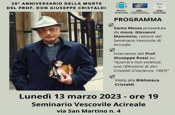 SEMINARIO VESCOVILE DI ACIREALE - ORE 19 In occasione del 25° anniversario della morte del prof. don Giuseppe Cristaldi, lunedì 13 marzo 2023 alle 19.00, nel Seminario Vescovile di Acireale, la comunità ecclesiale acese e l’Università Popolare si riuniranno nel Seminario Vescovile di Acireale per ricordare la sua vita operosa…